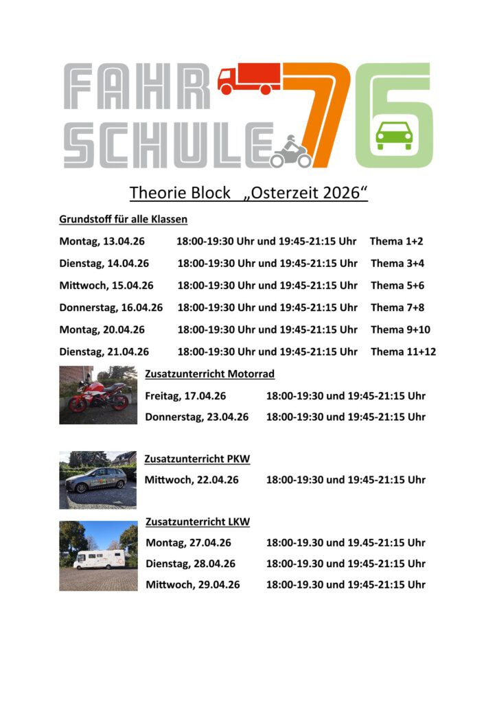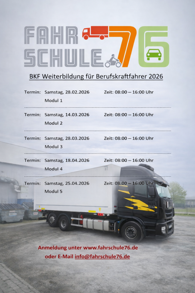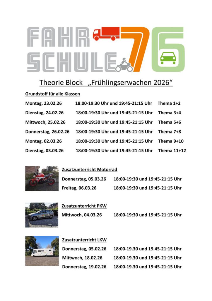 Theorie Unterrichtszeiten LKW, PKW, Motorrad und Erste-Hilfe / Module BKF