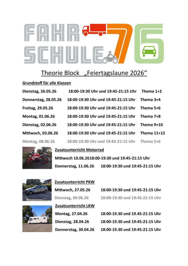 Theorie Unterrichtszeiten LKW, PKW, Motorrad und Erste-Hilfe / Module BKF